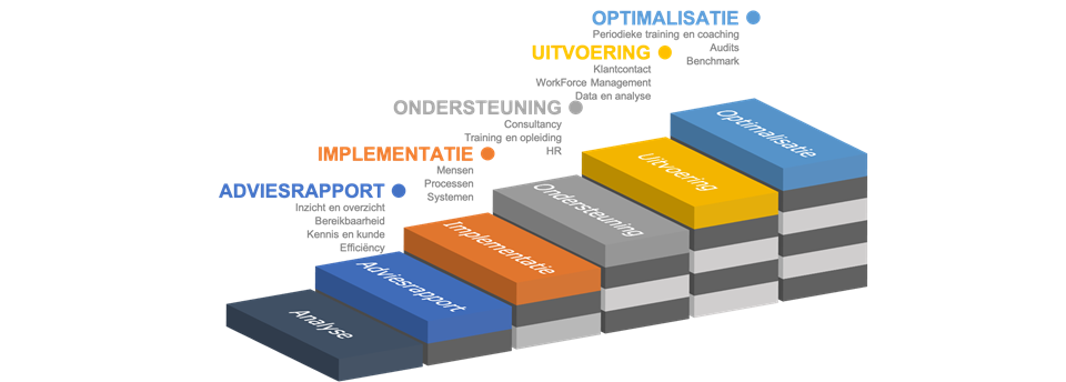 - Volledige scan, analyse, adviesrapport, hulp bij implementatie en ondersteuning bij uitvoering (klantcontactwerkzaamheden, WFM, Data-analyse)